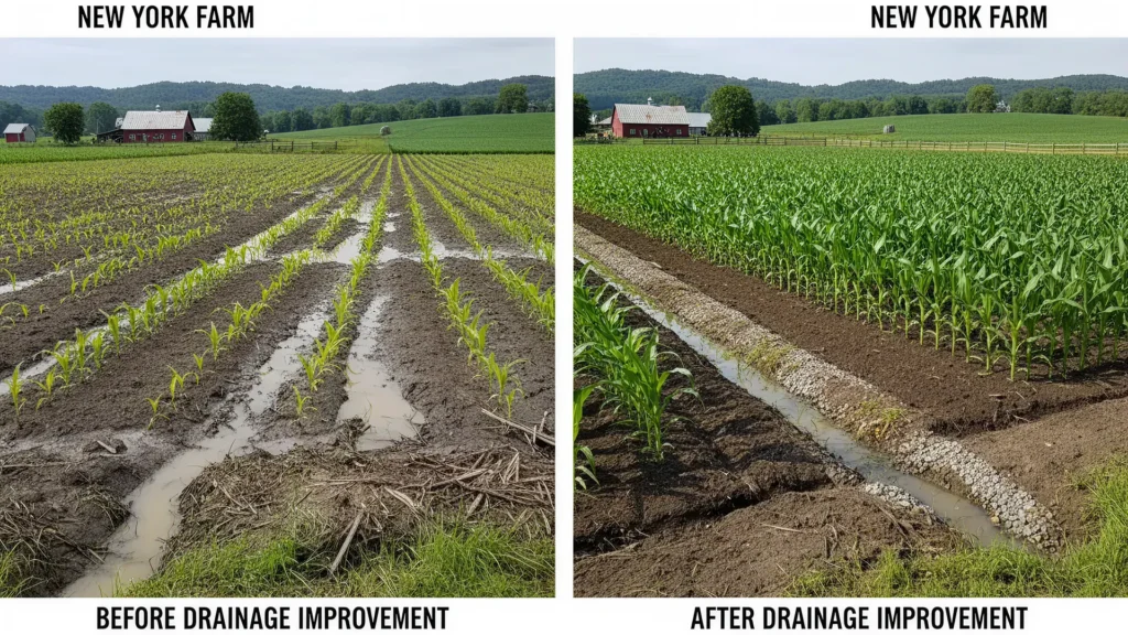 Western New York farms often struggle with flat terrain. Water moves slowly, and even minor blockages cause pooling. In the Finger Lakes region, erosion and nutrient loading affect both farm productivity and downstream water quality.